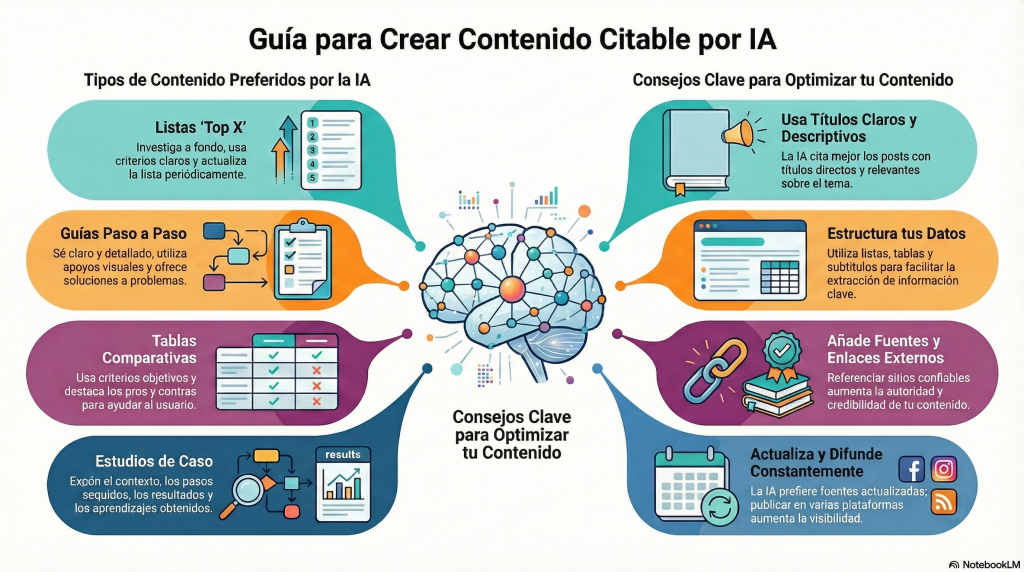 Ciertos formatos de contenido son inherentemente más propensos a ser identificados y citados por los sistemas de IA debido a su estructura, densidad de información y utilidad. A continuación se detallan los tipos de publicaciones más efectivos y las directrices para su correcta elaboración.